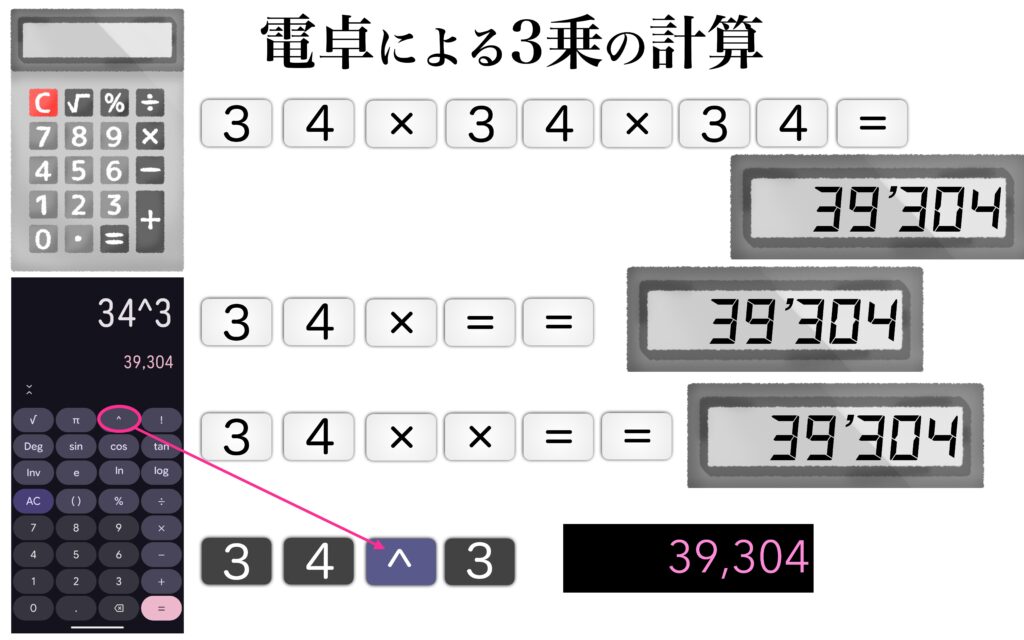 です。これ以外にも累乗の入力方法があります。電卓のメーカーによって累乗の入力方法が異なります。次の3つが一般的です。
