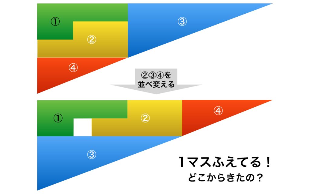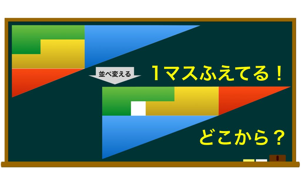 一見すると2つの直角三角形は形も大きさも同じに見えます。それにもかかわらず1マスすき間が増えているのですから。さあ、この謎解きできますか。
