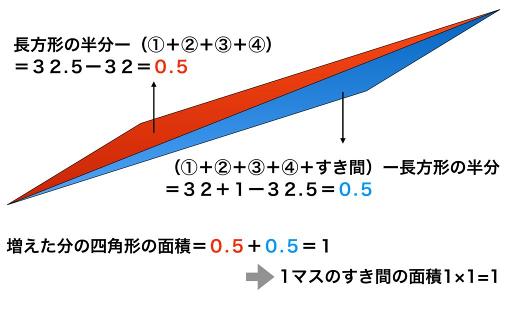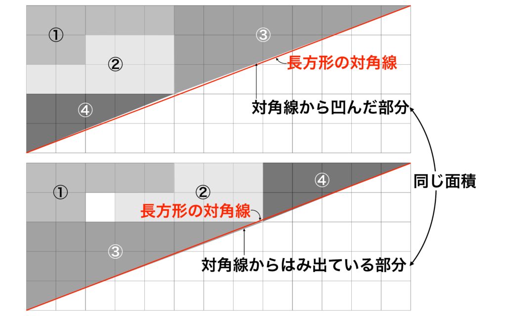 つまり、移動の前後で、直角三角形にみえる図形の面積と長方形の半分の面積との差はどちらも0.5という小さい値であることから、③④の斜辺をつなげたラインが見た目で折れ線には見えずに長方形の対角線に見えてしまいます。