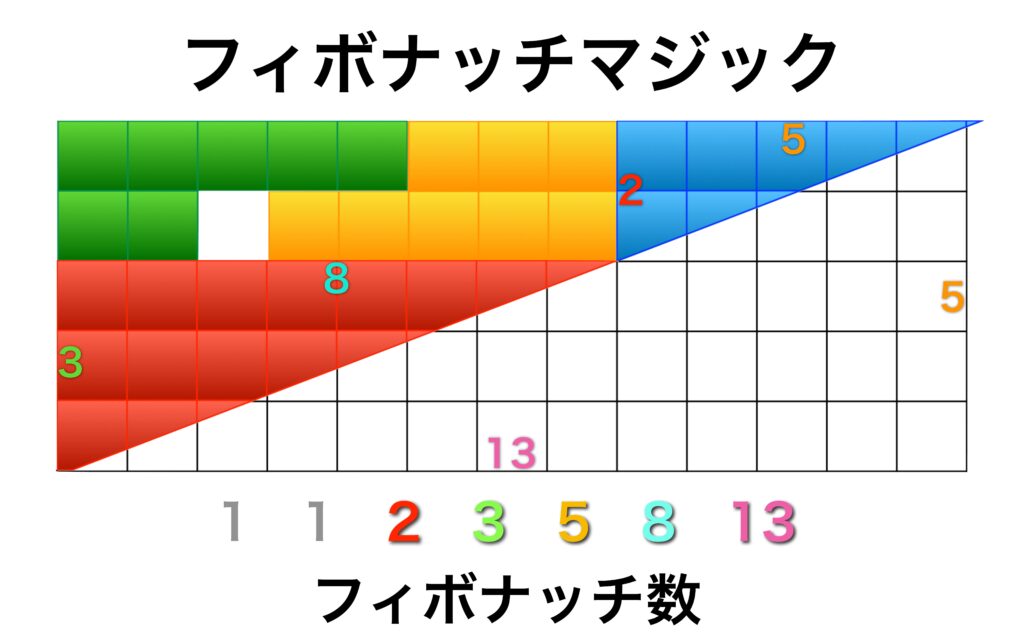 青と赤の直角三角形の縦横の長さはそれぞれ2と5、3と8です。そして長方形の縦横の長さはそれぞれ5と13です。これらの数はフィボナッチ数1、1、2、3、5、8、13、…の2から13までの数です。