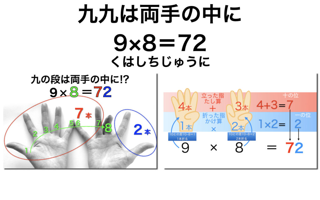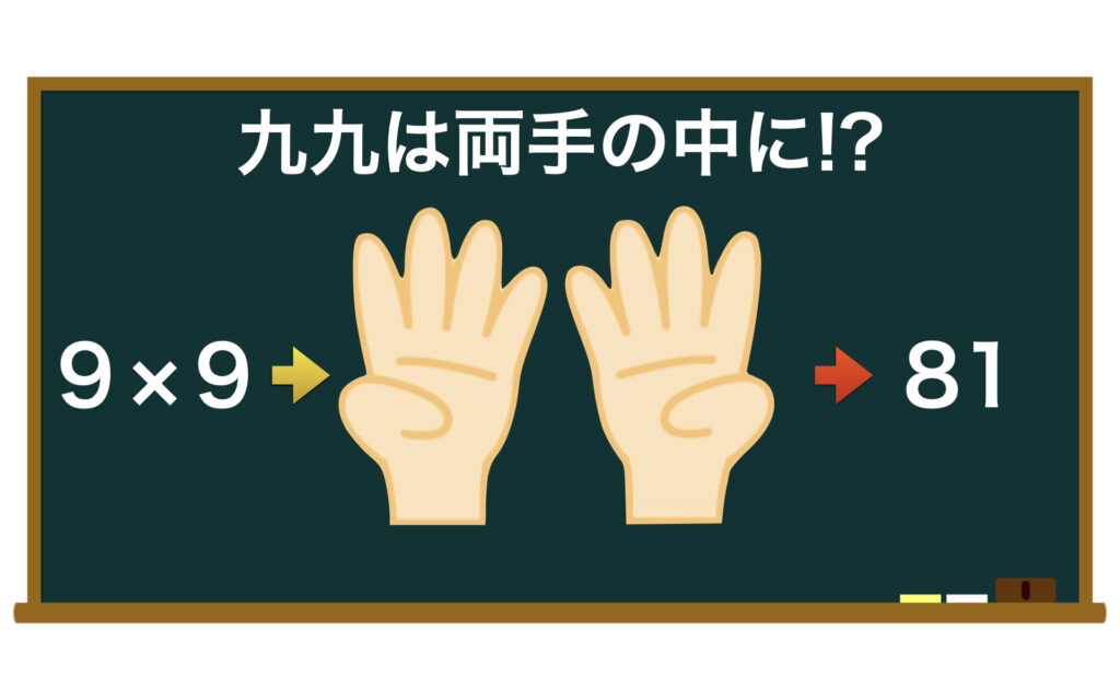 前回は九九の九の段が両手の中にあることを紹介しました。実はそれ以外の九九も両手で計算する方法があります。5以下×5以下の九九さえ覚えれば、5以上×5以上の九九が計算できてしまいます。