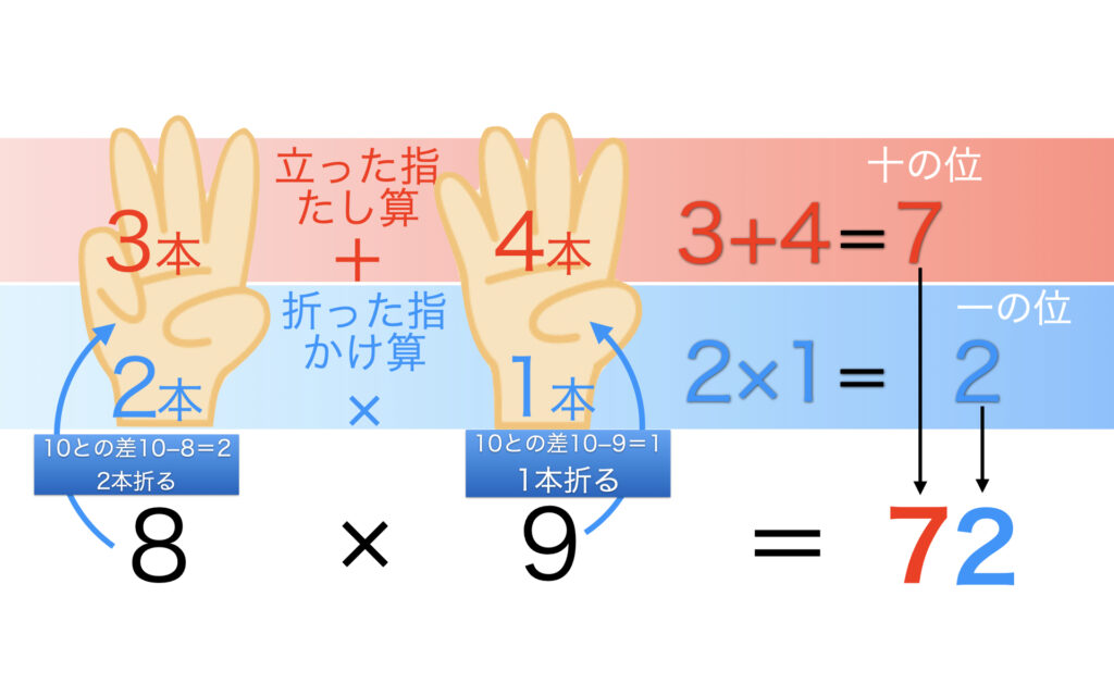 8×9であれば、左手で8、右手で9を表します。10との差だけ指を折ります。8は10との差は2、9は10との差は1なので左手は2本、右手は1本指を折ります。これで準備OK。10に足りない数だけ両手の指を折ります。