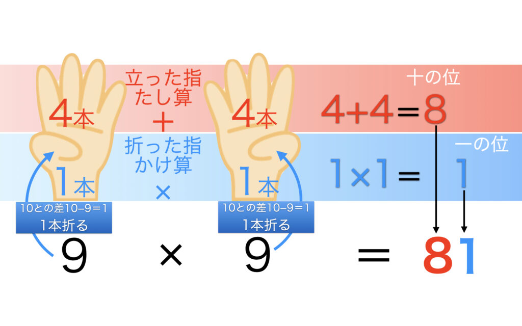 左手で9、右手で9を表します。10との差だけ指を折ります。9は10との差は1なので左手も右手も1本指を折ります。すると、立っている指は左手4本、右手4本なので合計して4+4=8。これが答えの十の位。