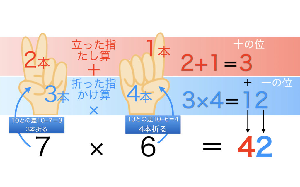 左手は10−7=3、3本指を折ります。右手は10−6=4、4本指を折ります。折った指の数同士をかけて3×4=12。一の位の2は答えの一の位。十の位の1は答えの十の位にたします。立っている指は左手2本、右手1本なので答えの十の位は合計2+1=3、さきほどの1とあわせて答えの十の位を3+1=4とします。4と2を合わせて7×6は42。