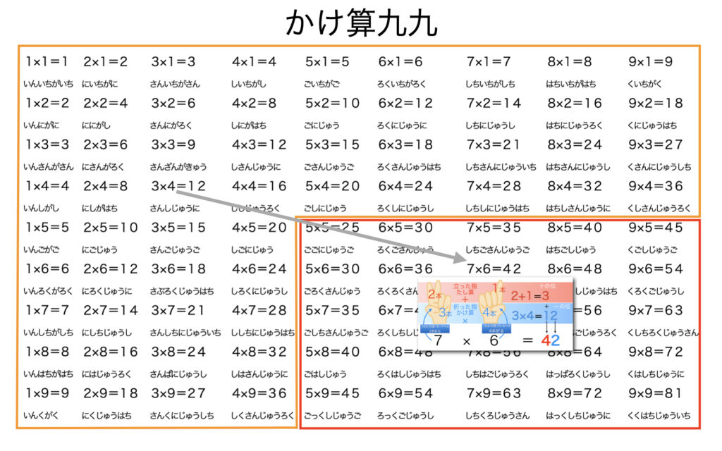 こうして81通りの九九のうち、5以上×5以上の組合せ5×5=25通り(図の赤囲み内)は残りの56通り(図の橙囲み内)を用いて計算できることがわかります。