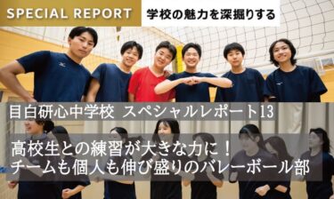 目白研心中学校のバレーボール部は、男女それぞれ中高合同で活動している。高校生からよい刺激を受けて成長している中学生の部員と顧問の先生に話を聞き、練習の様子を取材した。